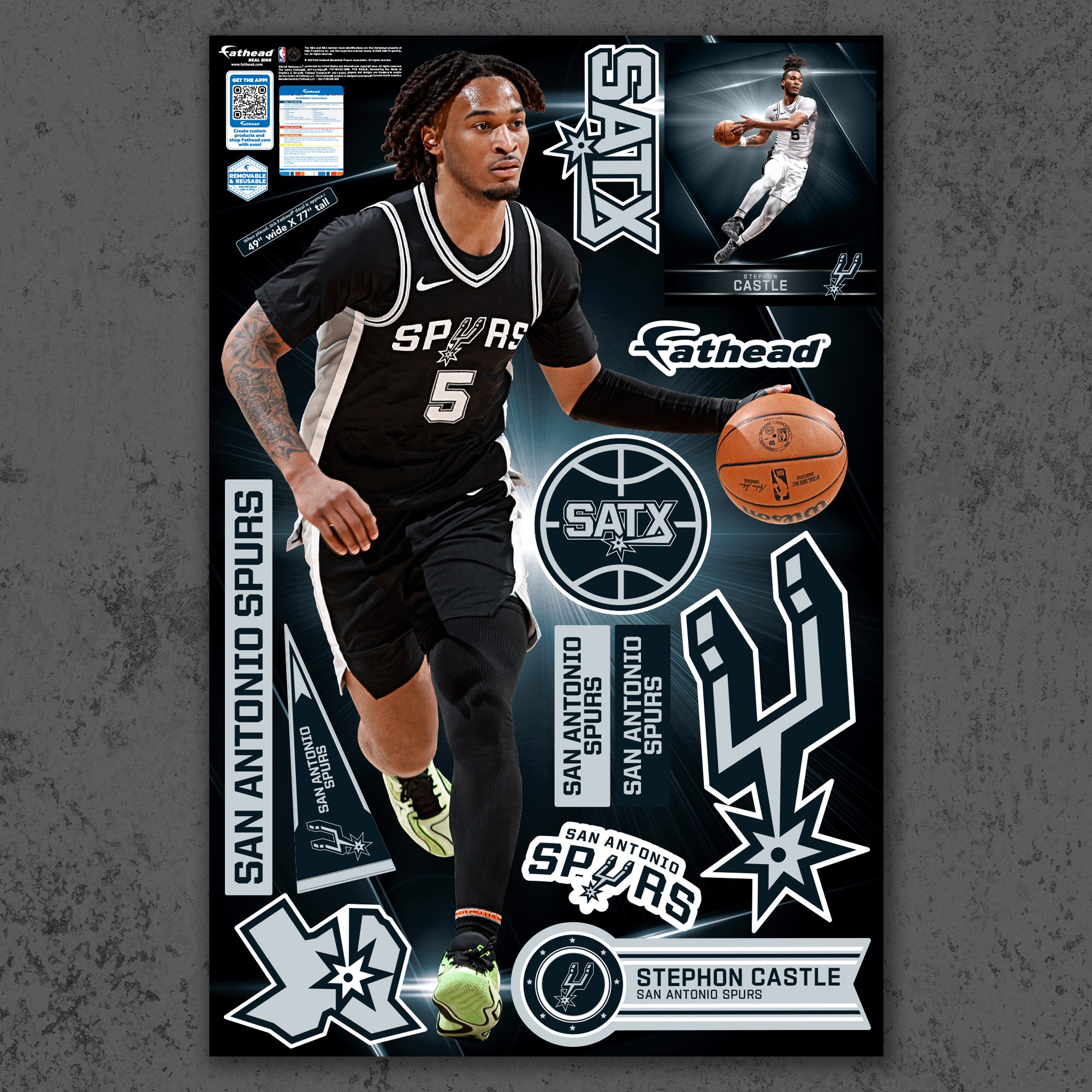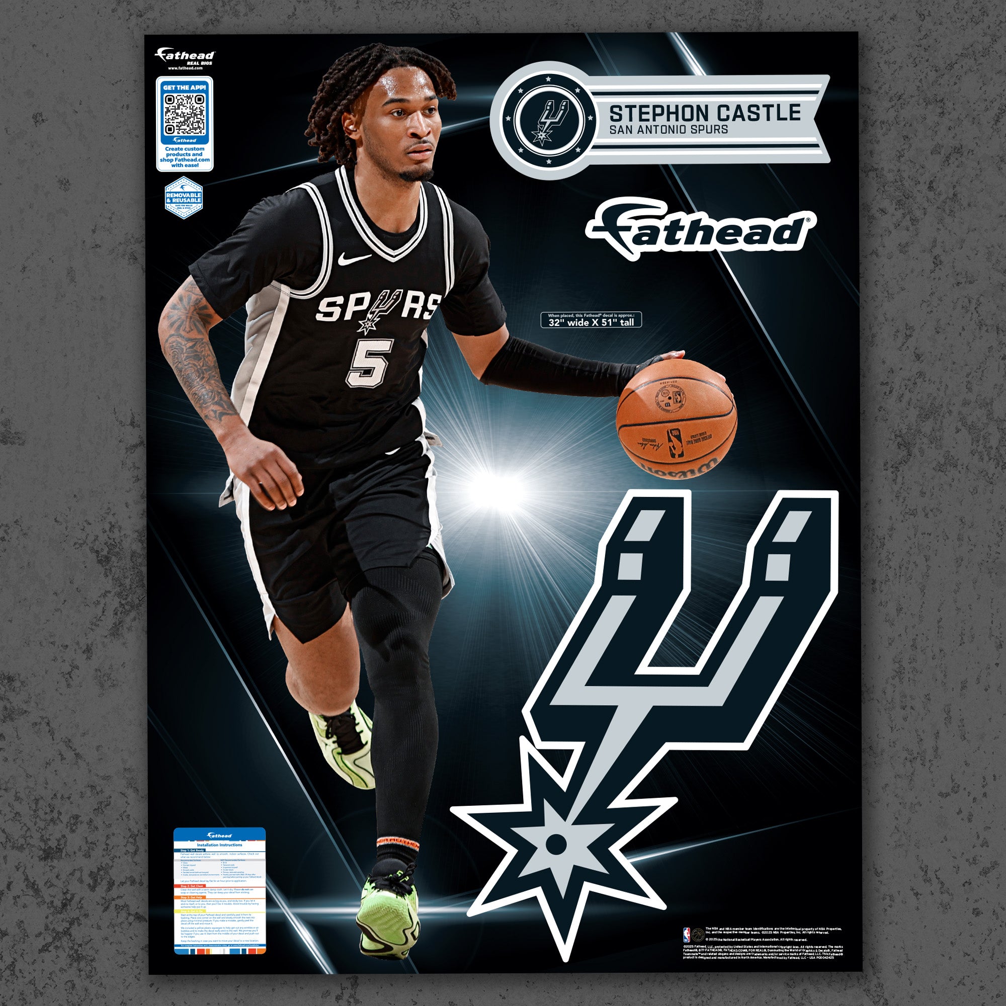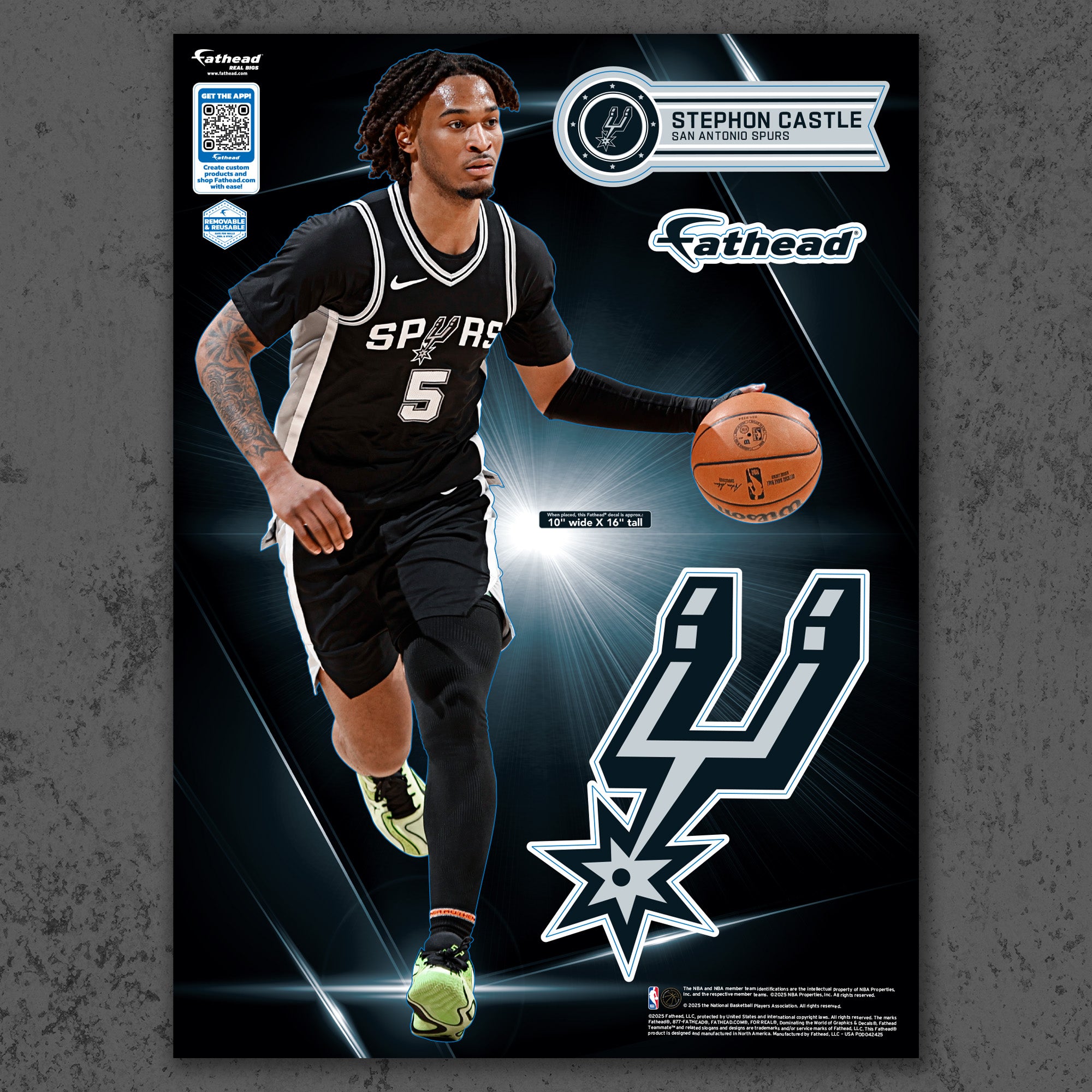 Stephon Castle soars through the air, his dynamic pose captured in vivid detail on this large-format RealBig Collection wall decal. Officially licensed by the NBA and designed for San Antonio Spurs fans, this reusable vinyl decal brings the energy of the game into your personal space. Durable, scratch-resistant, and easy to apply, it transforms any room into a vibrant showcase of your team spirit. With bold, fade-resistant colors, this decal is not just a decoration—it's a celebration of your fandom, designed to inspire excitement every day.