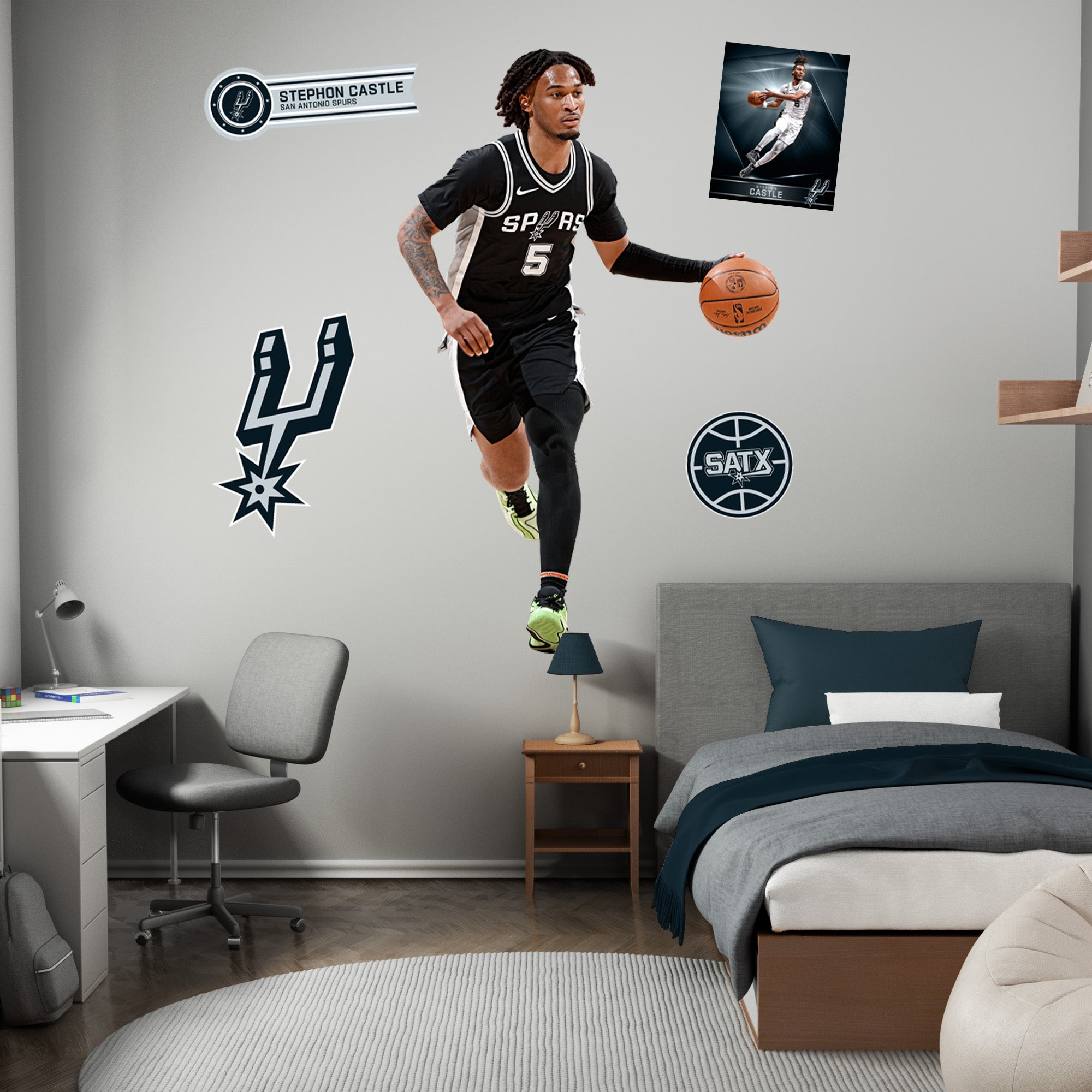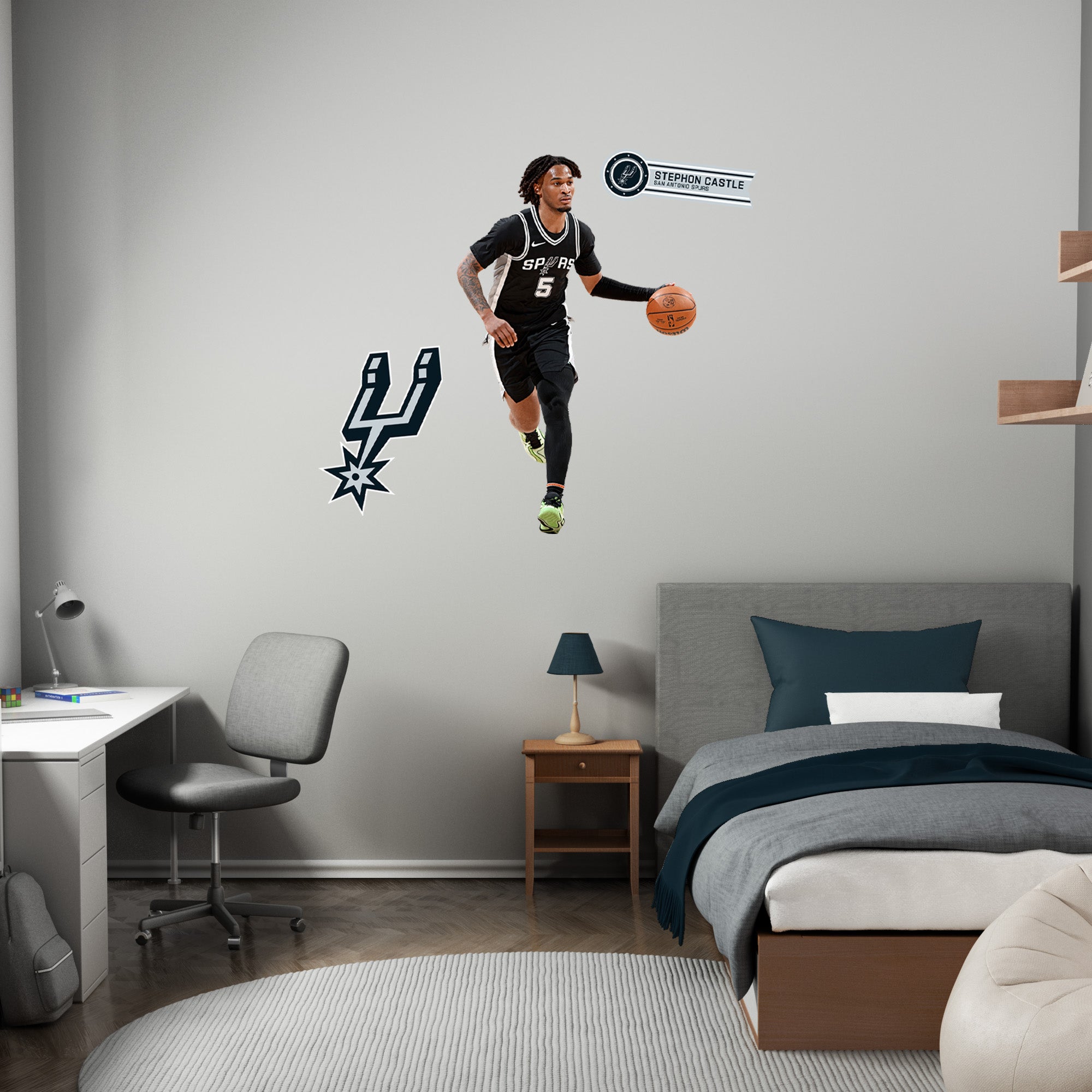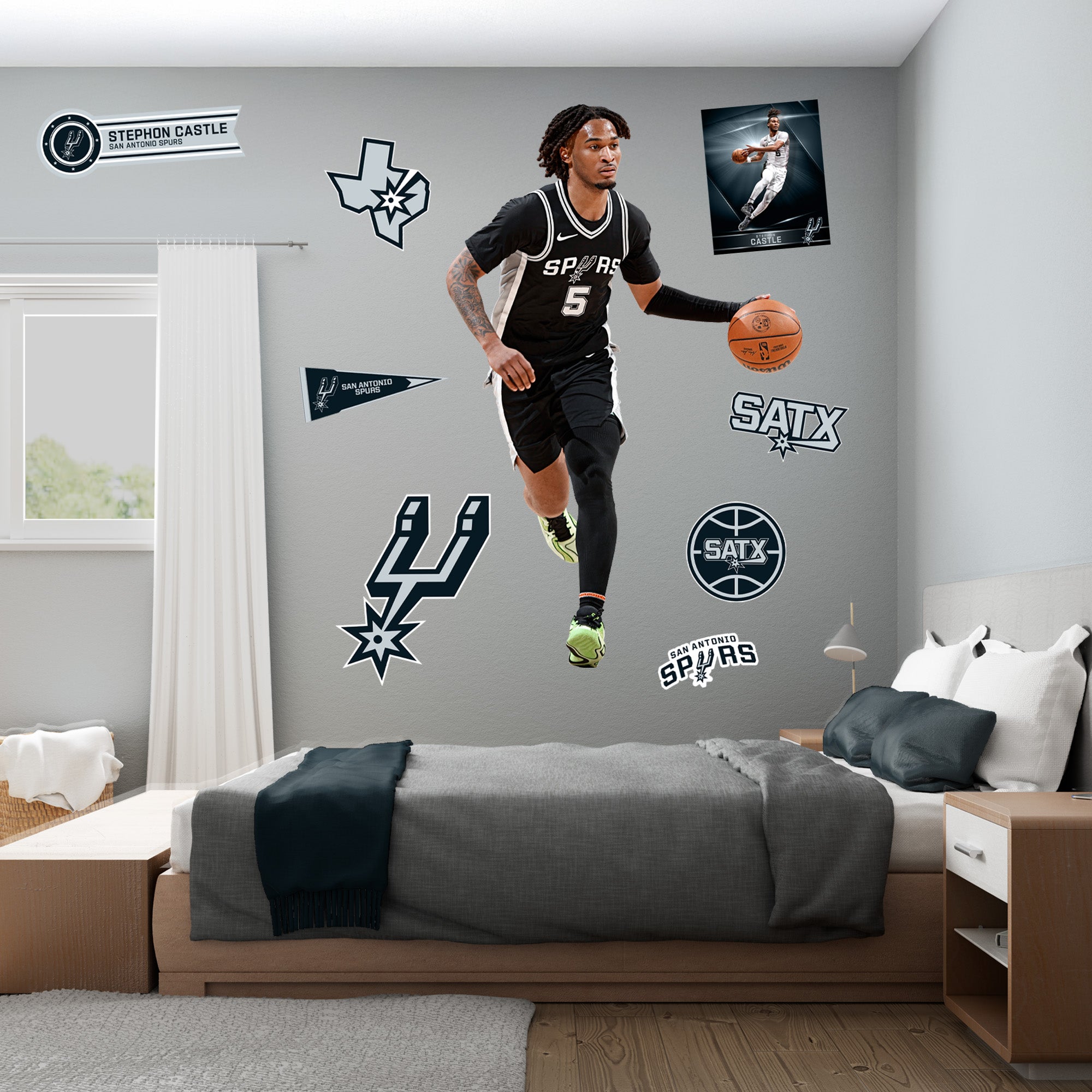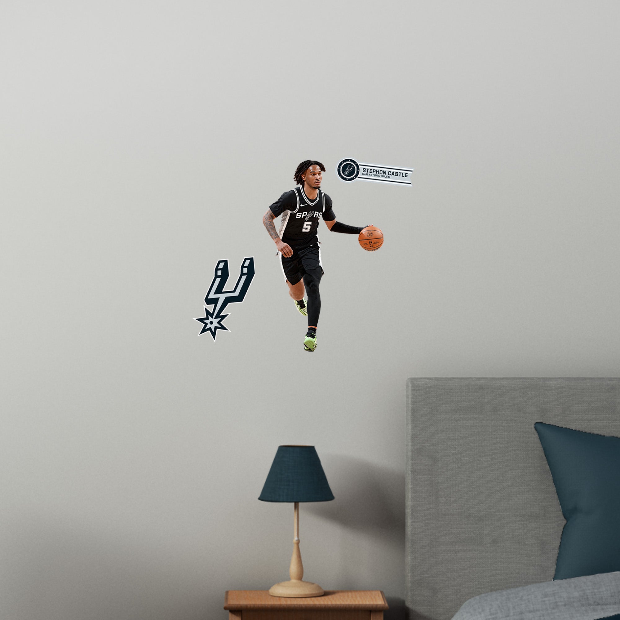 Stephon Castle soars through the air, his dynamic pose captured in vivid detail on this large-format RealBig Collection wall decal. Officially licensed by the NBA and designed for San Antonio Spurs fans, this reusable vinyl decal brings the energy of the game into your personal space. Durable, scratch-resistant, and easy to apply, it transforms any room into a vibrant showcase of your team spirit. With bold, fade-resistant colors, this decal is not just a decoration—it's a celebration of your fandom, designed to inspire excitement every day.