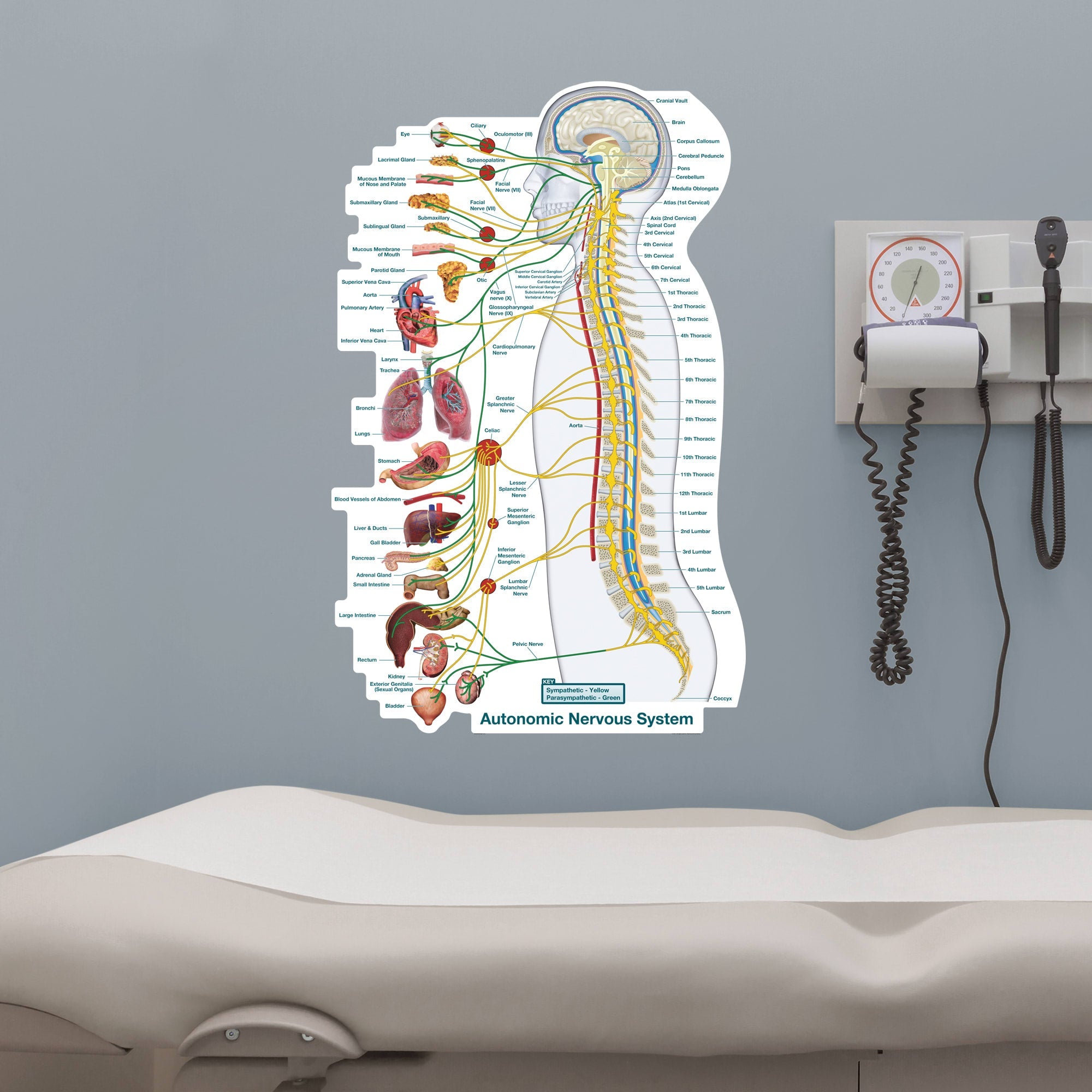Flaunt the captivating intricacies of the human body with this detailed, lateral diagram of the autonomic nervous system. Nerve pathways are color-coded to indicate the parasympathetic and sympathetic divisions. Easy-to-read labels identify key anatomy on the nervous system and corresponding organs. This high-quality, reusable reference tool is an invaluable resource for students, teachers, doctors and patients. Display the thick, high-grade vinyl graphic in exam rooms and classrooms to inspire an inquisitive look into the fascinating regulatory system.