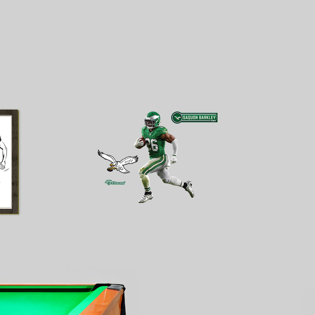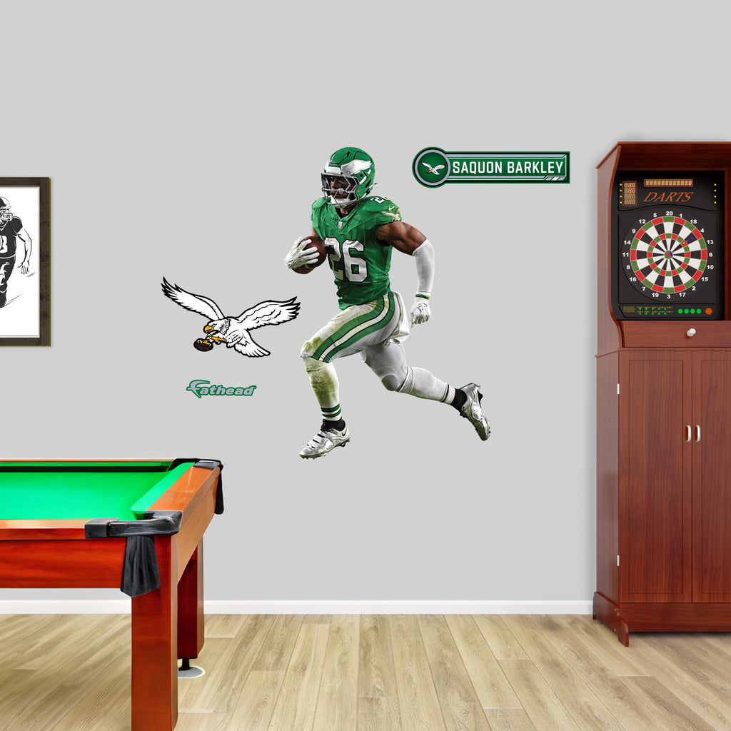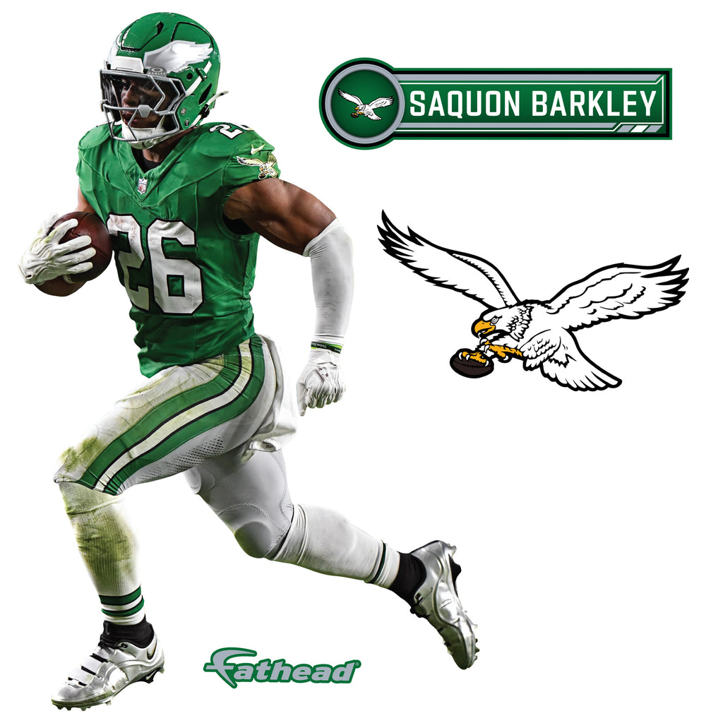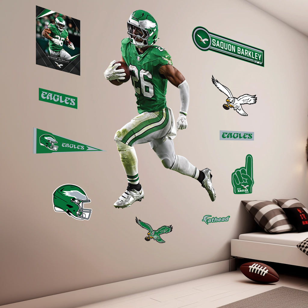 Transform your space into a Philadelphia Eagles fan haven with the RealBig Saquon Barkley Throwback Collection Vinyl Wall Decals. These vibrant, precision die-cut decals bring your walls to life, capturing the spirit of the game and your favorite athlete. Made from premium vinyl, they offer a scratch-resistant finish and fade-resistant inks, ensuring your walls stay dynamic and colorful for years. The low-tack adhesive makes them easy to apply, reposition, and remove without leaving any residue, allowing you to customize your space effortlessly.